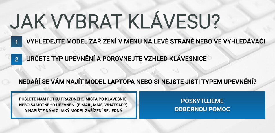 Vaše klávesnice Acer , Apple , Asus , Dell , Lenovo , Gateway , HP , Medion , MSI , Samsung , Sony , Toshiba nebo jiného výrobce již nefunguje tak jak by jste si představovali? Nejste si jisti, která klávesa do laptopů bude správnou volbou? Máte pochybnosti zda pant je shodný s tím ve Vašem zařízení? Nevíte jak provést demontáž tlačítka? Objednali jste si klávesu, ale máte pochybnosti týkající se montáže? Chcete vyměnit poškozenou klávesu, ale nemůžete najít v našem obchodě model svého zařízení? Kontaktujte nás. S radostí Vám pomůžeme.